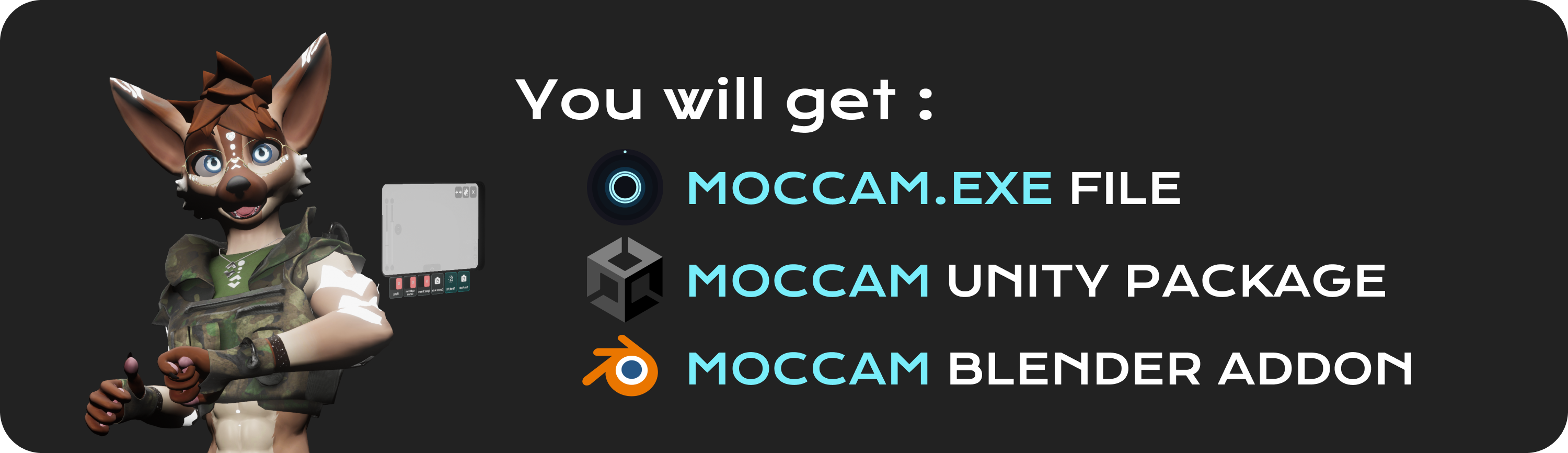 🎥MOCCAM - Motion Capture Camera for VRChat Hyroe3 ratings€15+15eur🎥MOCCAM Pack💾The App (Zip file) + Access to the community server 📦The Unity Package🧩The Blender add-on115eurName a fair price:€Add to cart39 salesAdd to wishlist New wishlistShareShare on XShare on Facebook Copy linkCopy product URLRatings5(3 ratings)355 stars100%4 stars0%3 stars0%2 stars0%1 star0%