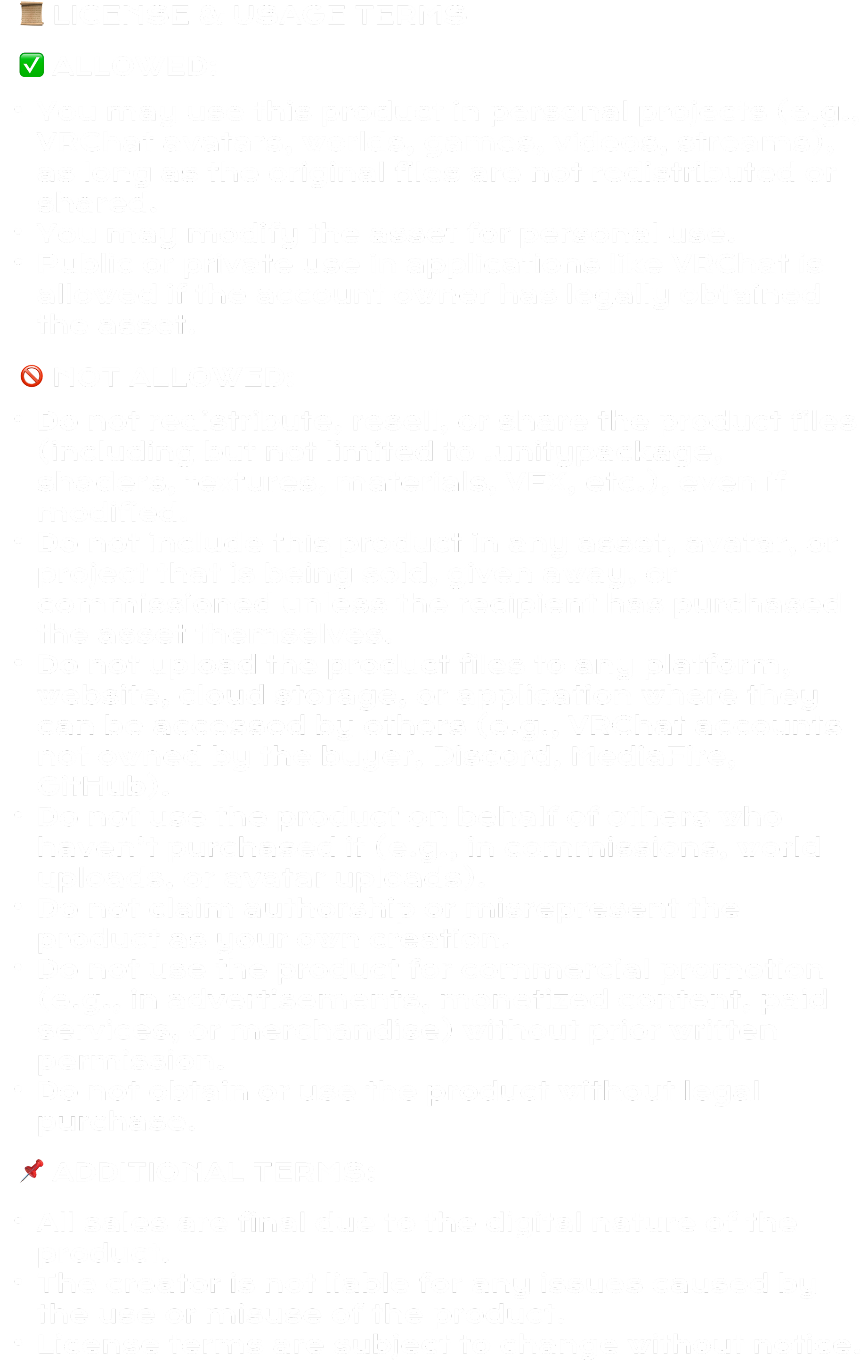 Installation is made easy with VRCFury — simply drag & drop the prefabs onto your avatar and you're done!